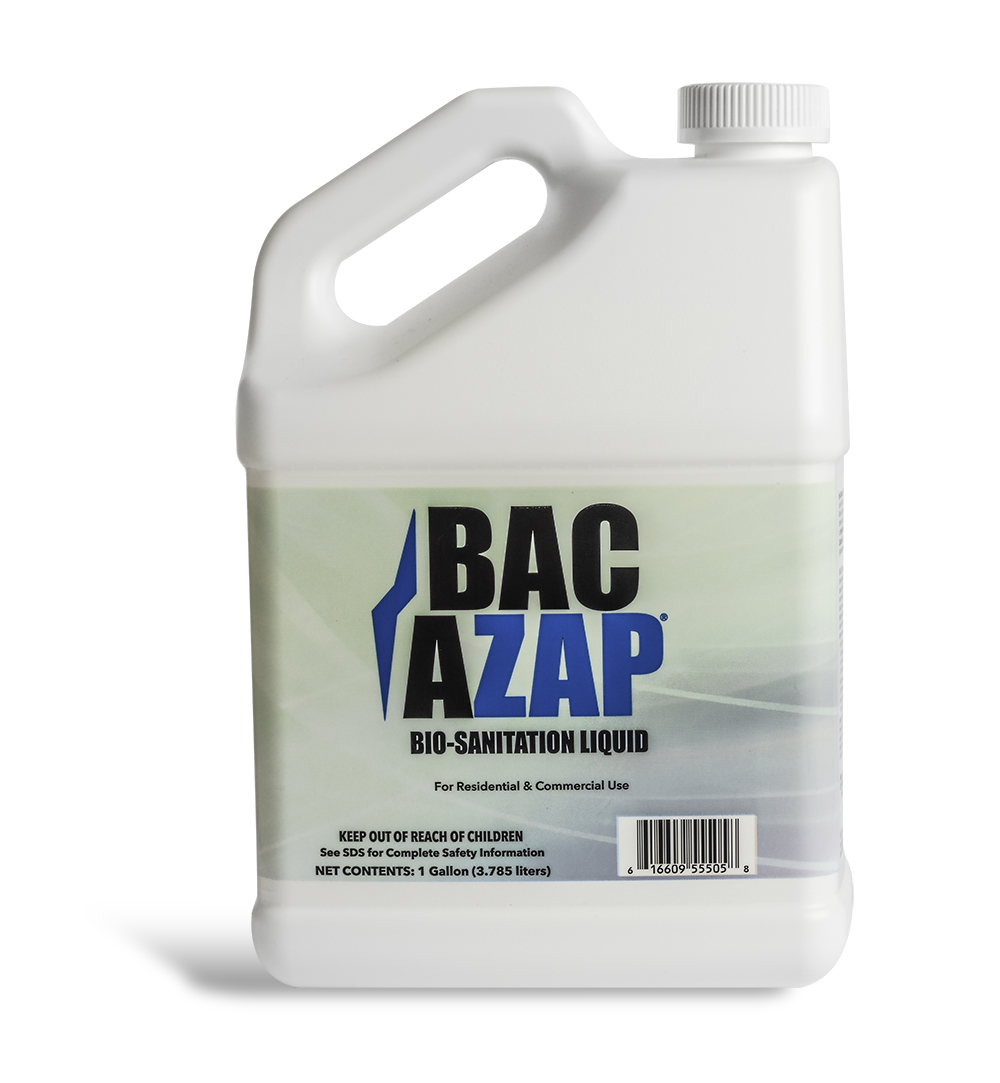 Bac-Azap Odor Encapsulation Technology is a liquid that uses a triple action to eliminate organic odors. Replaces tough odors with a fresh scent, encapsulates the odor molecules, then a blend of microbes goes to work to consume organic odor-causing matter, eliminating the source of the odor. Excellent for eliminating dead animal, urine, vomit, feces, smoke and other organic odors and for keeping drains clear of organic build-up.