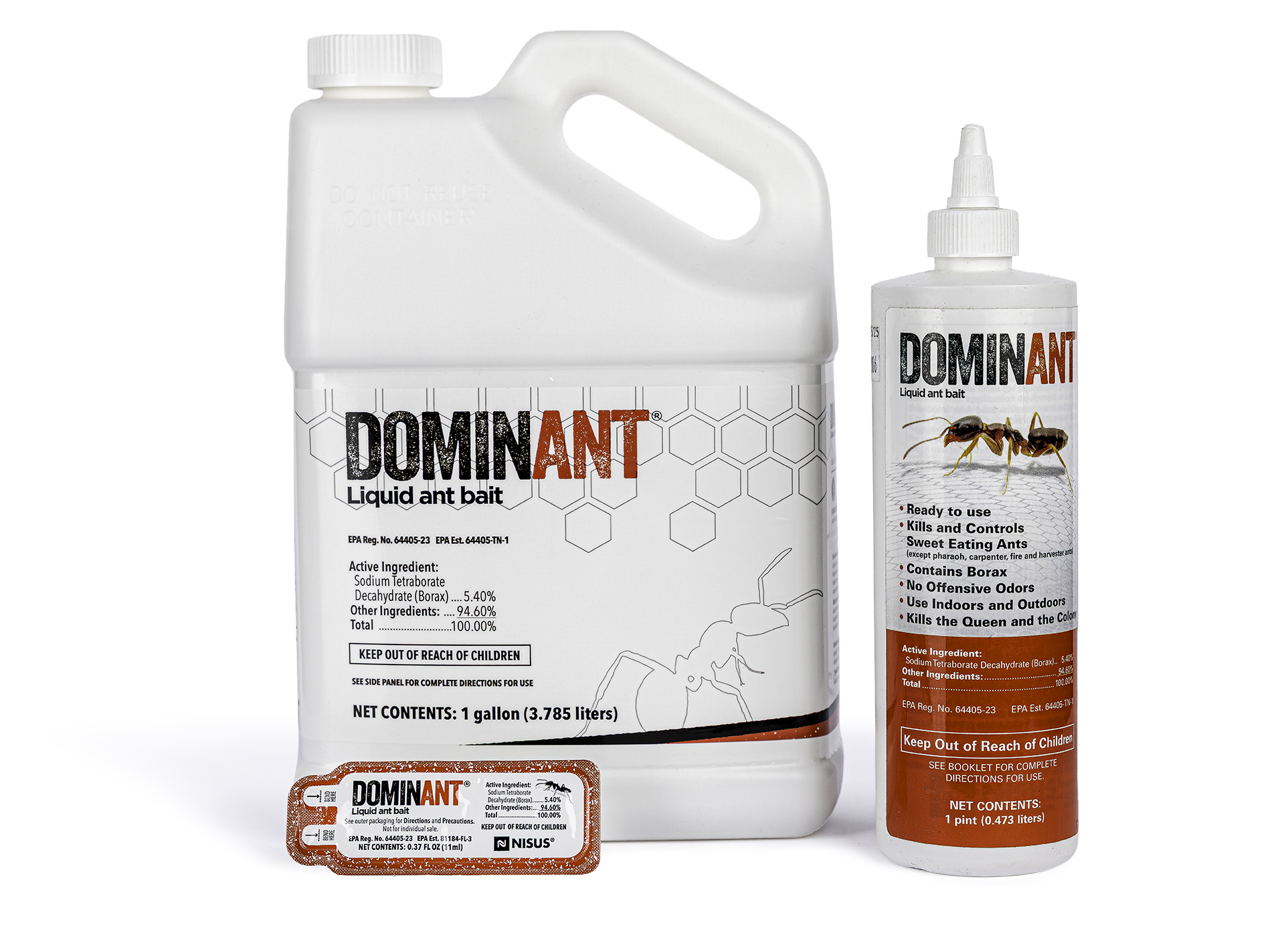 DominAnt Liquid Ant Bait's super-sweet attractant instantly attracts ants, which flock to it in minutes. It kills and controls most common household ants and their colonies. DominAnt is extremely attractive to ants, so when sweet-eating ants find a food source in your customers' homes, simply apply Dominant in a liquid bait station near the trailing ants and watch as the ants swarm the station. Because ants are social insects, they will bring the bait back to their colony where it is shared and kills the colony – including the queen. DominAnt is available in gallon and pint containers.
